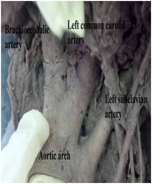 The arch of the aorta lies in the superior mediastinum and extends from the level of the second right sternocostal joint and ascends diagonally and to the left anterior to the trachea and descends to the left of the fourth thoracic vertebral body continuing as the descending thoracic aorta.1 The arch of the aorta normally gives rise to three branches namely the brachiocephalic, left common carotid and left subclavian arteries. This is the most common pattern occurring in about 65-75% of the population.1‒6
