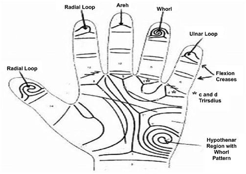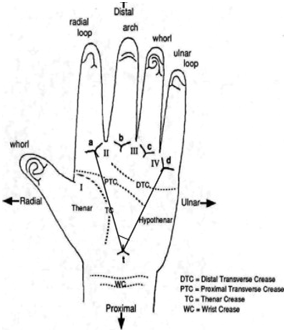 Figure 2 Digito-palmar dermatoglyphics: triradii, palmar creases and “atd” angle (from google images).