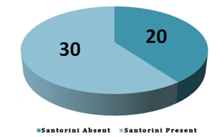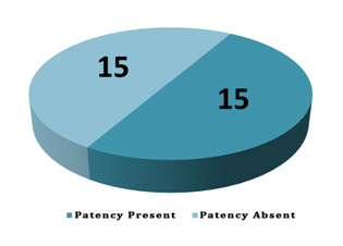 Accessory pancreatic duct was present in 60% of the cadavers; the length ranged between 9 and 65 mm, with a mean of 29.48mm and the width, between 1 and 4mm with a mean of 1.9mm. In 15 of the specimens Santorini´s duct showed patency and in 20, an affluent from the uncinate process was found. The following types may be considered relating patency (A: patent, B: not patent) and diameter (1: <2mm, 2: ≥2mm): A1,5;A2, 10;B1,7 and B2,8 (Graph 1& Graph 2).