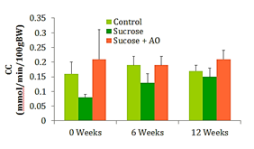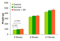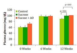 Significant differences in blood glucose were seen at week 12 between the control and the two sucrose-fed groups. No significant difference in mean fasting blood glucose was seen between the sucrose-fed group and the sucrose+AO group (Figure 2). AO supplementation did not improve fasting blood glucose levels at the termination of the experimental timeline (Figure 2).