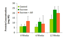 Figure 4 Protein Concentration; Effect of Antioxidant supplementation on protein concentration over 12 weeks. Data are represented as means ± standard deviations.