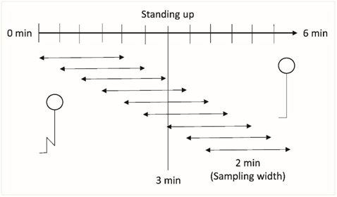 First, subjects completed a questionnaire to assess personal attributes such as age, height, weight, and sex. Then, for each subject, electrodes for a two-channel infrared oxygen monitor (NIRO-200NX, Hamamatsu Photonics) were applied to the forehead, a blood pressure monitor was wrapped around the upper arm (BP-608 Evolution II, Omron Colin Co., Ltd.), and surface EMG electrodes were applied to the chest (P-EMG plus, Oisaka Electronic Equipment Ltd.). The subject put on HAL before HAL-assisted standing segment. After a subject was fitted with the monitoring devices, he or she sat down in a 30cm-tall chair and maintained the sitting posture for 5min, after which monitoring was started. The subject remained seated for 3min, stood up when given the signal to stand at the 3min mark, and then remained standing for 3min. After those 3min had passed, the subject sat down and rested for 5min. Data were recorded over the 3min before and 3min after subjects stood up. The order of active standing and HAL-assisted standing was randomized for each subject. ECGs recorded from the surface EMG monitor were analyzed using heart rate variability analysis software (Bimutas Video, Kissei Comtec Co., Ltd.) and the indices of autonomic activity LF and LF/HF were calculated. Heart rate variability was analyzed over 120-s intervals starting every 30s, so a total of 9 intervals were analyzed (Figure 1).