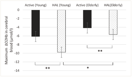 A comparison of the maximum decrease in cerebral blood flow (ΔO2Hb) is shown in Figure 2. Values differed significantly between active standing and HAL-assisted standing in both the elderly group (p<.01) and the young group (p<.01). When the age groups were compared, it was found that the maximum ΔO2Hb was greater in the young group. Besides the values differed significantly between elderly group and young group in HAL-assisted standing (p<.05).