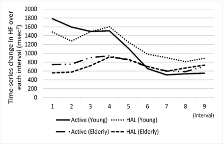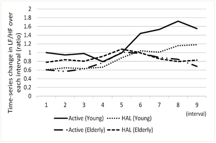 Figure 4 shows time-series changes for HF over all intervals. Figure 5 shows time-series changes for LF/HF over all intervals. The HF component decreased from before standing to after standing, so the LF/HF ratio increased from before standing to after standing. Both HF and LF fluctuated more widely in the young group than in the elderly group. When these values were compared between the two standing conditions, a significant difference in LF/HF between active standing and HAL-assisted standing was found at the second interval for the elderly group (p<.05). In the young group, however, there was no significant difference in HF or LF/HF at any interval.