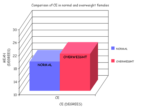 Figure 1 showed comparison of CE in control and overweight females. It was observed that there was a decrease in CE angles in normal females as compared to overweight females on calculating t-value. The result was significant at p<0.10.