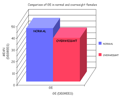 Figure 2 showed comparison of GE in normal and overweight females. It shows there is a decrease in GE angles in overweight females as compared to normal females on calculating t-value. The result was significant at p<0.001.