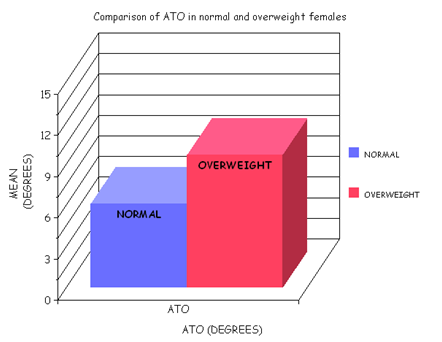 Figure 3 shows comparison of ATO in normal and overweight females. It shows there is a decrease in ATO angles in normal females as compared to overweight females on calculating t-value. The result was significant at p<0.001.