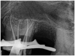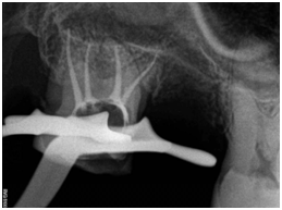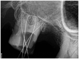 Access cavity preparation was performed under local anaesthesia of 2% lignocaine with 1:2,00,000 epinephrine. Inflamed pulpal tissues located in the pulp chamber were removed and internal anatomy revealed 3 main root canals: mesiobuccal (MB), distobuccal (DB), and palatal (P).Later DG 16 endodontic explorer was used to explore any additional canals. A small haemorrhagic point was noticed around 3-4mm mesial to the main palatal canal indicating a second palatal canal. The regular triangular access cavity shape was modified to a trapezoidal shape in order to gain proper access to the additional canal. The pulp was extirpated, and working lengths of each canal were determined by means of an electronic apex locator (Root ZX; J Morita) and then confirmed by a radiograph (Figure 2). Initial instrumentation of the canals was done with #10 SS files (Dentsply Maillefer).Canal instrumentation and debridement were carried using the crown-down technique with Protaper Rotary files(Dentsply/Maillefer). Apical preparation was performed till F1 for MB, DB canals and F2 for MP and DP canals (Figure 3). Canals irrigated using 2.5% NaOCl and EDTA, access temporized with ZOE cement and appointment was concluded.