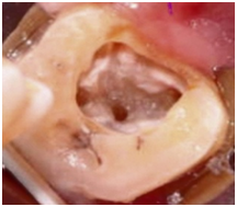 Figure 3 Clinical examination showing 4 root canal orifices: 2 buccally and 2 palatally (mirror image).