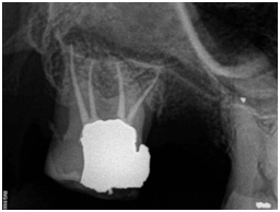 At the next visit, patient was symptomatic and hence obturation was initiated. Master cone selection was done with the corresponding Pro-taper Gutta-percha cones (Dentsply/Maillefer) (Figure 4) and AH Plus sealer (Dentsply/Maillefer). A radiograph was taken to establish the quality of the obturation (Figure 5). And then the tooth was restored with a posterior composite filling (P60; 3M) and a final radiograph was taken (Figure 6).
