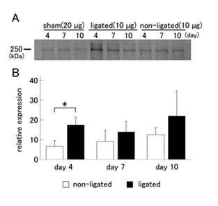 Removal of the ligation of the duct induces regeneration of parotid glands in 7 days [5], suggesting that progenitor cells are activated and proliferate during ligation. Progenitor cell markers may decrease after recovery of salivary glands. Therefore, we examined the change in expression levels of nestin during duct ligation. The amount of nestin protein on the ligated and non-ligated sides of glands was compared with that in sham-operated glands. Nestin demonstrated an upward trend on the ligated side at all time points compared with the non-ligated side and sham-operated glands. Nestin was slightly increased, even in the non-ligated gland compared with that of sham-operated glands, but the amount was lower than on the ligated side (Figure 2A). Next, we quantified the amount of nestin protein and performed statistical analysis. Nestin expression on the ligated side was significantly increased at day 4 compared with the non-ligated side. On the other hand, no significant differences between the ligated and non-ligated sides were observed at days 7 and 10 (Figure 2B).