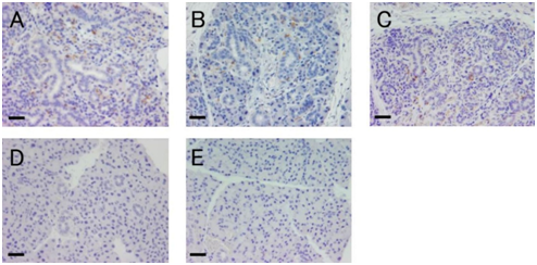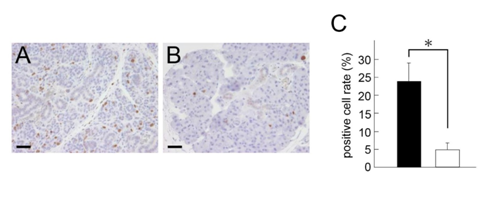As shown in Figure 3, the expression level of nestin was significantly increased at day 4. Therefore, we focused on day 4 and performed immunohistochemistry for Ki-67, a marker of cell proliferation. Ki-67 was detected in atrophied acinar, duct cells and interstitial tissue (Figure 5A). On the non-ligated side, Ki-67-positive cells were detected in acinar and duct cells (Figure 5B). On the ligated side, Ki-67-positive cells were significantly increased compared with the non-ligated side (Figure 5C).