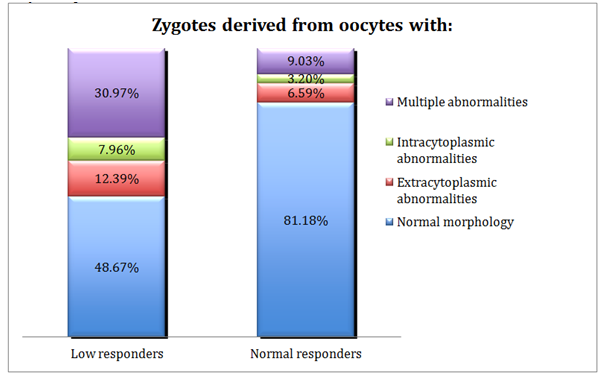 Figure 1 Percentage ratio of the zygotes obtained in relation to the morphological features of the oocytes in patients with low and normal ovarian reserve.