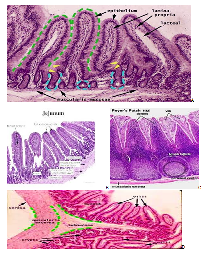 The ileal mucosa contains large number of organized lymphoid tissue (lymphoid follicles) termed payer’s patches. The payer’s patches serves as both a primary and secondary lymphoid organs payer’s patches are critical components of the GALT.3 The various regions of the small intestine in the domestic mammals are not clearly defined microscopically as they are in human beings. For examples the submucosal glands do not extends the full length of the duodenum in sheep, goats and carnivores whereas in horses, cattle and pigs, these glands extend into the Jejunum.1 Likewise, the aggregated lymphatic’s nodules (Payer’s patches) often considered an identifying features of the Ileum, may be seen anywhere along the small intestine of domestic mammals.4