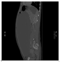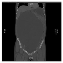 24 year old female patient who attends to overall control, at the time of referred was found asymptomatic in history but I indicated that her mother had died of liver sarcoma no other antecedent family, personal or surgical, referred menarche at 13 years, with regular menstrual cycles without recent changes from cycle frequency or amount of menstrual bleeding, condom use as a method of family planning for 6 years, when no gestational history, clinical examination only increased abdominal girth positive ascetic wave was evident, no changes in abdominal surface vasculature, masses or palpable organ enlargement were evident, no abdominal pain or discoloration of skin or mucosa, thus possible ascites was considered establish and given rise to this initial studies to study origin of ascites were requested. During the next control, no changes compared to previous clinical examination were evident in paraclinical transaminases and bilirubin. the reports in normal parameters, hematology and normal clotting times, quantitative BHCG<0.10mIU/mL (negative) and abdomen total ultrasound showed limited by the large amount of free fluid in the abdominal cavity, with decreased bilateral renal size and dilated right renal pelvis, study no proper evaluation of abdominal organs was achieved by a free liquid, the above clinical suspicion gave gynecopathologists possible neoplasic whereby extension tests were completed including abdominal tomography contrast to study possible neoplastic lesions. For the next control in clinical examinations showed a normal peripheral blood smear, differential protein and globulin normal blood, a 0.90mg/dl for CKD-EPI GFR 88.3mL/min/1.73m2, HIV testing and syphilis serology negative, alpha-fetoprotein 0.9ng/dl (negative), carcinoembryonic antigen 1.32ng/ml (negative), CA 07.16 19.9 IU/ml (negative), CA 125 8.98UI/ml (negative) and the CT abdomen which was evident great mass apparently left adnexal cystic density occupies the whole of the abdominal cavity with mass effect on abdominal organs. Figure 1 & Figure 2 with compressive effect on the right proximal ureter setting moderate hydronephrosis, Figure 3. Therefore requested assessment by the Gynecologic Oncology Service, which program for exploratory laparotomy. Day May 19, 2018 was performed in the patient exploratory laparotomy, where a large cystic mass dependent left annex of about 35cm in major diameter was found. The colour pearlescent compromising left ovary, compression and abdominopelvic displacement organs which tumor resection of the left ovary, omentectomy and appendectomy was performed, samples were sent to pathology for initial study by freezing and subsequent histopathology block. The pathology report indicated: cyst benign ovarian serous papillary cystadenoma consistent, residual ovarian parenchyma with simple epithelial follicular cysts and inclusion in the other samples not suggestive evidence for histopathological changes. Neoplasms, acute or chronic conditions; cytology extracted cyst fluid was negative for malignancy. The patient is discharged after two days without, currently present complications of surgical procedure in outpatient clinical follow by the mass of secondary ovarian origin hydronephrosis.