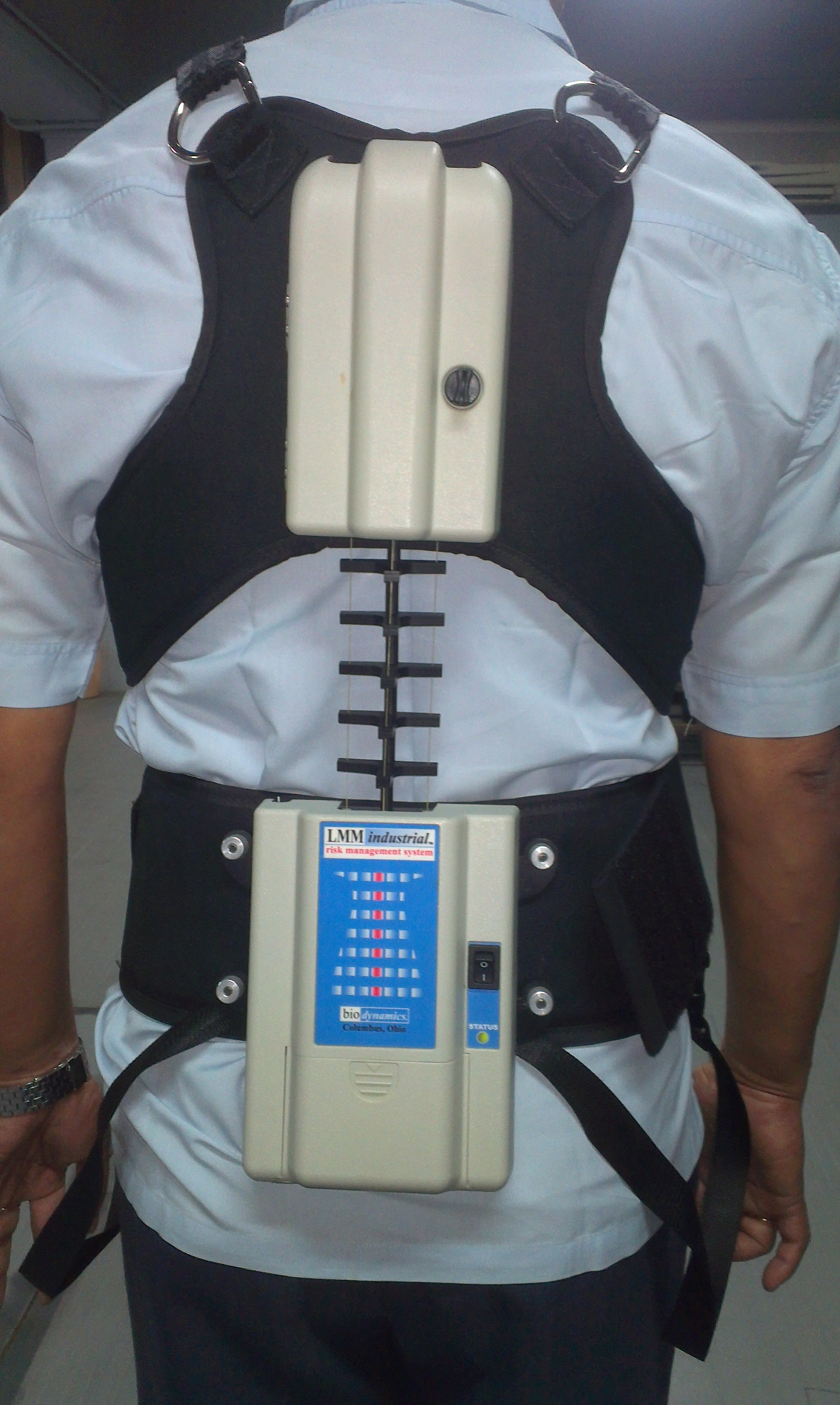 There had been plenty of evidence in the past decade that revealed that the asymmetric arrangement as well as the changing dynamic action of the trunk during work greatly affected the ability of a worker to perform a task. It was found to be due to decreased trunk strength as the trunk moved fast and more asymmetrically and thus loading of the spine was also believed to increase under these conditions. Therefore, it is necessary to document the asymmetry and dynamic motion characteristics of the trunk when workers are exposed to various load carriage tasks. The LMM is an exoskeleton of the spine that is orchestrated, so that transitory changes in trunk position, velocity and acceleration can be obtained in three-dimensional space. Researchers had shown that the LMM was about twice as accurate as a video-based motion evaluation system in estimation of lumbar spine mobility.13 There were a lot of advantages and connotations of using LMM for work assessment and clinical purposes (Figure 5 & 6).