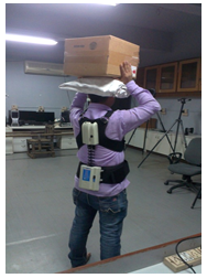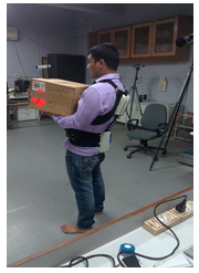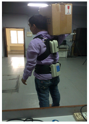 The volunteers were asked to walk straight-line at self-selected speed on the level ground for a distance of 75 meters in three different given conditions- I) head load (20% of body weight) II) hand load (20% of body weight) and III) shoulder load (20% of body weight). The subjects were asked to wear their regular attire. Volunteers were instructed to pick the load boxes from the knuckle height, so that they could observe their picking and then carry the load and keep it at the same height. The square size of the box was held constant and the dimension of the box was 40cm×40cm×16cm. While the workers were performing the task, they were being continuously monitored so that trunk motion and loading characteristics could be assessed. Lumbar kinematic parameters like Average Twisting Velocity (ATV), Maximum Sagittal Flexion (MSF) and Maximum Lateral Velocity (MLV) were recorded by the iLMM and displayed online on the interfaced laptop through the Ballet 2.0 software during walking. Based on the Lumbar kinematics recorded, the software also predicted the risk of Low Back Disorder.