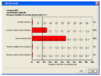 The study was conducted by using Industrial Lumbar Motion Monitor (iLMM), made Bio-Dynamic Solutions, Inc. c/o NexGen Ergonomics, Inc. USA and Ballet 2.0 software, BIOMEC Inc. USA.7 The iLMM is a tri-axial electro- goniometer that acts as a lightweight exoskeleton of the lumbar spine. It was positioned on the back of a subject directly in line with the spine and attached by harness at the pelvis and thorax. Four potentiometers at the base of the iLMM measured the instantaneous position of the spine in there-dimensional space relative to the pelvis, as the subject performs tasks. Position data from the potentiometers were recorded at 60Hz, transmitted to an analog-to-digital (A/D) converter, and then recorded on a microcomputer. The data were then processed to calculate the position, velocity and acceleration of the spine in each of the three planes of motion as a function of time. Measurements were taken where accomplished through wireless telemetry from the iLMM to a laptop computer. The assessment of spine loading focused on the forces imposed on the lumbosacral junction (L5/S1) during the materials handling task. This low back location is where most back injuries occur.