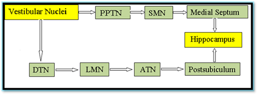 The major anatomical pathways through which the vestibular signals reach the hippocampus is represented in Figure 2.
