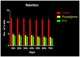 From the analysis, it is observed that, the treated Groups (B and C) shows significant decrease in number of trials taken for both acquisition and retention when compared with the Control (Group A), but no significant difference was observed between the Group B (Physostigmine) and Group C (RVS). In retention from the 50th day of retention onwards a considerable reduction in number of trails were seen within each treated groups. This indicates that Rotatory Vestibular stimulation and physostigmine equally responsible for LTP.