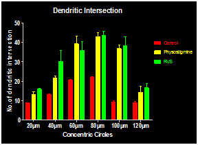 From the analysis it is clear that the dendritic intersection increased from 40 µm concentric circle to 80µm concentric circle, in each group but dendritic intersection gradually decreased in 100 µm and 120µm. Dendritic intersection at its peak was observed in 80 µm. Results shown in Figure 7.