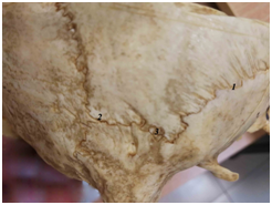 In the current investigation there were two skulls with the presence of additional bones, which differ from the structure of normal bones. The first skull had 5 bones, which were situated on the border between sutura lambda and sutura sagitalis. The first and second WBs from the frontal part of sutura sagitalis on the side of the parietal bone were of a large size with multiple interdigitations (Figure 1). The third and forth were small to medium sized and squashed in a side orientation. The fifth bone had a medium size and merged laterally with the left part of sutura lambda.