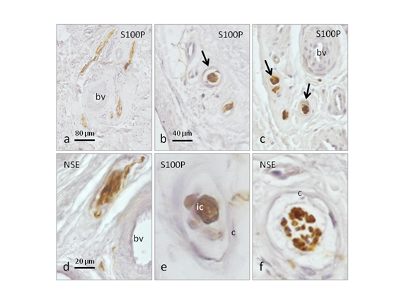 Figure 1 Immunohistochemical localization of general nerve markers (neuron specific enolase for axons; S100 protein for Schwann cells and Schwann related cells in sensory corpuscles) in sections of normal anterior cruciate ligament. Perivascular nerves (a), and different kinds of sensory corpuscles were found (b,c), especially Ruffini-like corpuscles (d), Pacini-like corpuscles (e), and globular sensory corpuscles (f). Scale bar: 80 µm for a; 40 µm for b and c; 20 µm for d,e,f.