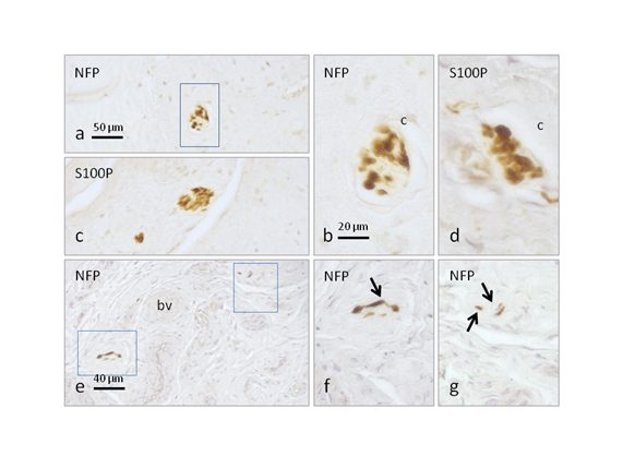Figure 2 Immunohistochemical localization of general nerve markers (neurofilaments for axons; S100 protein for Schwann cells and Schwann related cells in sensory corpuscles) in sections of semitendinosus and gracilis tendon muscles used to reconstruct anterior cruciate ligament 12 years ago. Scarce capsulated sensory corpuscles (a-d) and isolated nerve fibbers (e-g) were observed. Scale bar: 50 µm for a and c; 40 µm for e; 20 µm for b,d,f and g, arrows indicate nerve fibbers.