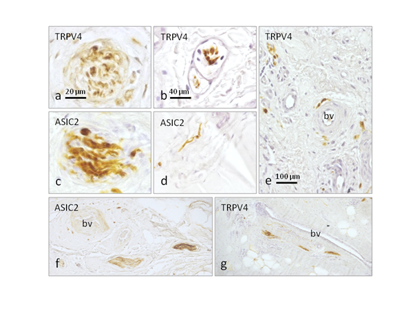 Figure 3 Immunohistochemical localization of the putative mechanoproteins ASIC2 and TRPV4 in sections of normal ACL (a-d) and in sections of semitendinosus and gracilis tendon muscles used to reconstruct anterior cruciate ligament 12 years ago (e-f). Ruffini-like corpuscles display ASIC2 and TRPV4 immunoreactivity in normal ACL (a,c), as well as the capsulated multiafferented corpuscles (b) and the free nerve fibres (d). In the tendon-grafted surgical piece ASIC2 and TRPV immunoreactivity were detected in small nerve bundles (e,f) and perivascular free nerve fibres (9). Scale bar: 20 µm for a and c; 40 µm for b and d; 100 µm e,f and g.