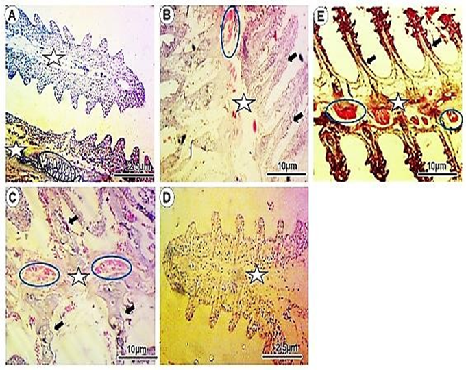 Figure 1 Photomicrograph of the gills of juvenile Clarias gariepinus exposed to graded dose of lead (Pb), pulverized neem leaves (PNL) and mango leaves (PML). (A) Control: Shows primary gill filaments (star) with lateral extension kwon as secondary lamellae. Gill filaments have a central cartilaginous support (black oval surrounding the cartilage), H and E. Scale bar, 2.5μm. (B) PNL and 15mg/L of Pb: Shows congested gill filament vessel (blue oval), partially obliterated secondary lamellae. (C) PNL and 10mg/L Pb: Shows primary gill filaments (star) with congested vessel (blue oval), and obliterated secondary lamellae (D) PML and 15mg/L Pb: Shows primary gill filaments (star) with depleted cells. (E) PML and 10mg/L Pb: Shows congested gill filament vessel (blue oval).