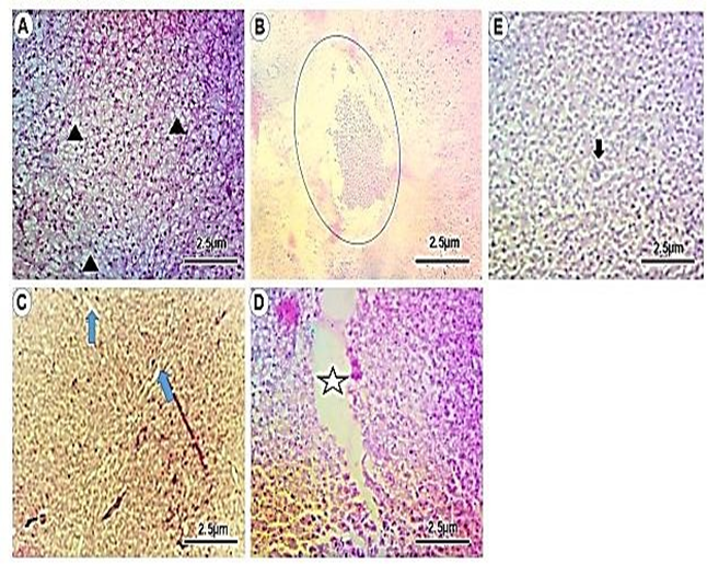 Figure 2 Photomicrograph of the liver of juvenile Clarias gariepinus Fig. Photomicrograph of the livers of juvenile Clarias gariepinus exposed to graded dose of lead (Pb), pulverized neem leaves (PNL) and mango leaves (PML). (A) Control: Shows the parenchyma composed of polyhedral hepatocytes typically with central nuclei. The nuclei of these cells are elongated and protrude into the sinusoidal lumen. (B) PNL and 15mg/L of Pb: Shows the depletion of hepatic parenchyma and infiltration lymphocytic cells into the parenchyma. (C) PNL and 10mg/L Pb: Shows fatty degenerated parenchyma with focal necrosis (black arrow). (D) PML and 15mg/L Pb: Shows the depletion of hepatic parenchyma (star) with fatty degeneration. (E) PML and 10mg/L PbShows fatty degenerated parenchyma with sinusoidal distortion (blue arrow).