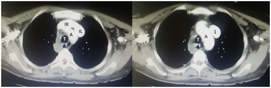 A 55year-old female patient with a right lateral neck mass was studied by a contrast-enhanced tomographic scan of both neck and thorax. Regardless of the mass that turned out to be an inflammatory lymph node, the patient was asymptomatic. Analyzing the veins of the region, it was noticed that the junction of both right and left innominate veins was in the upper mediastinum to the left side (Figure 1). At this point a vertical venous trunk originated and run vertically downwards in direction to the heart anterior to the aortic arch (Figure 2) (Figure 3), reaching the coronary sinus were it ended. The appearance was consistent with a LSVC. No SVC was identified on the right side with its typical course, nor other variants of the venous system were identified by the mentioned scan.