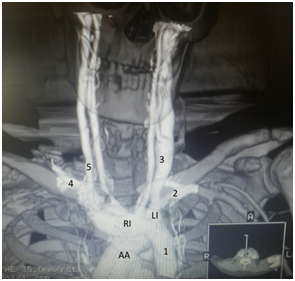 Figure 3 3D Volume rendering reconstruction. 1: LSVC with a vertical pathway through the left side of the mediastinum towards the heart. Note the origin of the LSVC by the junction of both innominate veins (RI and LI respectively).