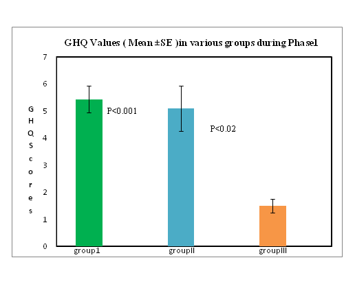 Figure 1 Comparison of GHQ values (Mean ±SE) in medical students classified into groups initially (phase1) based on GHQ scores and response to cold pressor test (CPT).