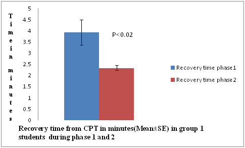 Figure 2 Paired sample comparison (intra group) of recovery time (minutes) from cold pressor test (CPT) in group I students (n=16) showing significant improvement from phase 1 to phase2.