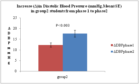 Figure 3 Significant increase in diastolic blood pressure with cold pressor test (CPT) in group II students (n=22) on application of exam stress during phase 2.