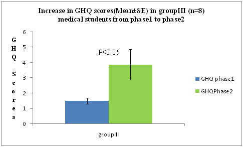 Figure 4 Paired sample comparison of GHQ scores in group III students (n=8) showing significant increase (P<0.05) from phase 1 to phase 2.