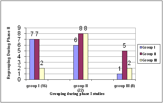 Comparison of the students who redistributed to various groups at phase 2 (Figure 5) (Tables 1–4) revealed that the severely stressed group I (n=7) which also remained severely stressed during the phase 2 studies was the most vulnerable group to applied stress. Those who remained in the same groups continued to experience similar degree of stress (n=15; Group I, n=7; Group II, n=8, Figure 5) or remained stress free throughout (n=2, Group III). Some students of group II (n=14) remained moderately stressed throughout [remaining in group II (n= 8) or by shifting to more stressful group I (n=6) at phase 2]. On the other hand, some of the students (n=12) exhibited inability to cope up with the applied stress though remaining less stressed at the initial stages [those students who shifted from group II to group I (n=6), group III to group I (n=1) and group III to group II (n=5)]. Some degree of adaptation and coping ability was revealed by students (n=17) who shifted from group I to group II (n=7) and considerable coping in students who shifted from group I to group III (n=2) and from group II to group III (n=8). Only 2 students remained stress free throughout the course of medical education and 96% of the students exhibited stress either initially or with application of stressor / passage of time.