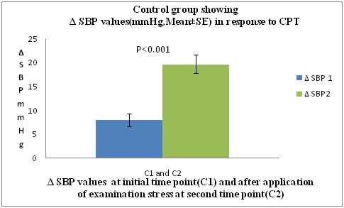 The control group (C1 to C2) exhibited significant stress revealed through increase in cold pressor test parameters (ΔSBP mmHg, Mean±SE from 8±1.4 to 19.79±1.9, P<0.001, Figure 6; ΔDBP mmHg, Mean±SE from 16.42±1.68 to 20±2.3, NS) with passage of time.
