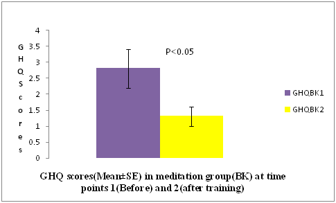 The results of our follow up studies revealed beneficial effect of Brahmkumari’s Rajyoga relaxation training. While the control group (C1 to C2) exhibited significant stress revealed through increase in systolic blood pressure response to cold with passage of time and application of stressor (Figure 6), the Rajyoga meditation group (BK) revealed decrease in the CPR parameters and improvement in GHQ scores (Figure 7) (Figure 8) indicating better handling of stress. The individual data also revealed improvement with Brahmkumari way of Rajyoga meditation (Tables 1–4).