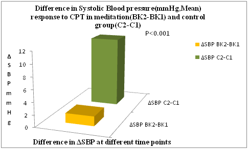 The GHQ scores (Mean±SE) of BK group declined (2.8±0.6 to 1.13±0.33, P<0.05, Figure 7) which indicates better handling of stress. The individual data also revealed improvement with Brahmkumari way of Rajyoga meditation. On intergroup comparison of the difference (independent sample comparison) in CPR parameters at the two points of time (BK2-BK1 vs C2-C1), highly significant increase was observed for ΔSBP (1.6 vs 11.7 mmHg in BK and C groups respectively, P<0.001, Figure 8) in control group indicating the beneficial role played by Rajyoga meditation. Thus the results reveal beneficial role of Brahmkumari way of Rajyoga meditation both directly and indirectly. The results revealed significant coping with administered stress at phase2 in BK group while control group exhibited significant stress.