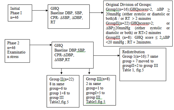 The medical students were divided into 3 groups, based on their initial GHQ scores (>2) & CPR parameters [DBP>20mmHg (either systolic or diastolic blood pressure) & /or recovery time>2 minutes] used as markers of stress, (Flow chart 1).