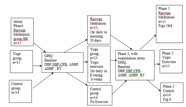 The study design employed to evaluate stress was conducted in two phases and same study design for follow up group. All the admissions of the undergraduate medical students were completed by the end of September. Hence the Phase I studies started in the month of November after the students got adapted to the medical education system for four weeks. Phase 2 studies were conducted before the send up examination (a known stressor) in the month of March next year. The medical students of next batch were administered relaxation exercises. It was felt desirable to avert development of cumulative stress related to course load by training the students for undergoing relaxation through yoga / Brahmkumari’ rajyoga meditation practices.