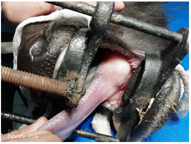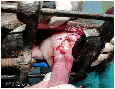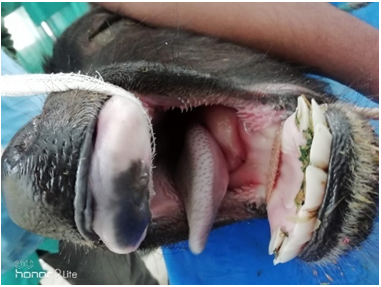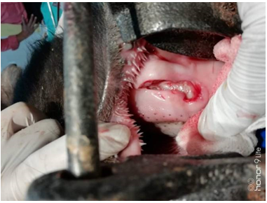 Initially animal was stabilized with 500ml of normal saline and 500ml of ringers lactate intravenously. Animal was mildly sedated with administration of midazolam @ 0.1mg/kg body weight intravenously. Furthermore, local anesthetic lignocaine 2 % was sprayed over the swelling. Mouth cavity was held open via Günter mouth gag. An intra oral mouth antiseptic washing was carried out by using the 0.05% povidone iodine. The swelling under the tongue (sialocele) was excised elliptically in order to facilitate the drainage of fluid (saliva). Later marsupialisation was done by using vicryl 1-0 and flushed with tincture iodine. This allows the sialocele to remain open and drain saliva into the mouth (Figure 1–4). The owner was advised to clean the oral cavity with povidone iodine for 7 days. Postoperatively, antibiotic, analgesic and fluid therapy was administered for 5 days. On 10thpost-operative day animal showed normal feeding habit and had normal recovery without any complications (Figure 5).