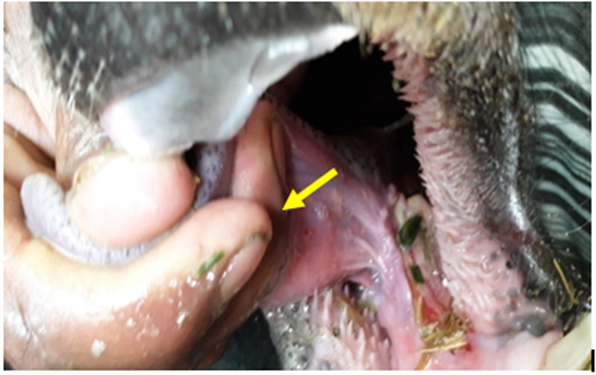 The main salivary glands in buffaloes consist of three pairs namely; parotid, mandibular and sublingual glands. The parotid duct emerges from the distal extremity of the gland and duct opens into the buccal vestibule at the parotid papilla.5 Whereas, mandibular duct and sublingual duct originates from the rostral border of the gland and it opens at the sublingual caruncle. According to Sagar et al.6 the common affections of the salivary ducts in buffaloes are ectasia of the parotid duct, salivary fistula, sialolith and sialocele. Sialocele is the most commonly recognized clinical disease of the salivary glands in dogs and is also described in humans, cats, ferrets, horses and ruminants.7 The sublingual sialocoele or mucocele is manifested with the fluid retention in the subcutaneous tissue and associated with an inflammation induced by accumulated saliva.8 The enzymes in the saliva are annoying to the surrounding connective tissues. Furthermore, cystic appearance of mucocele is due to the presence of inflammatory tissue around the saliva accumulated region/tissue.4 Development of non-epithelial origin of granulating tissue limits further swelling. Usually the swelling is painful in the beginning, which makes animals feel discomfort and hard to masticate.6,9 The predisposing factors for mucocele are unknown, but trauma is strongly suspected.8 Etiology for the present case might be due to intra oral trauma during ingestion of grass or excessive pressure or blunt injury over the salivary duct or sialoliths.8,9 In spite of location, the definitive treatment of a salivary mucocele involves excision of the offending or damaged salivary glands. Non-surgical treatments of mucocele like incisional drainage followed by infusion of irritants into cystic cavity to destroy the lining membrane and to prevented recurrence3. Surgical treatments like marsupialisation10 and unilateral removal of salivary gland9 are also reported. In the present case marsupialisation along with infusion of tincture iodine was done. Ranula in buffaloes previously reported on single side9 and or both11 with ptyalism, protruded tongue and inanition.12 Recurrence of the serocele or sialocele is rare after surgical treatment but may indicate incomplete removal of the affected salivary tissue, or that the incorrect gland was removed.2 Although bilateral ranula treatment is simple, it must be differentiated from actinomycosis, foreign body abscess, bottle jaw, foot and mouth disease and hemorrhagic septicemia.
