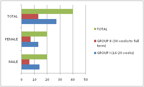 In the present study a total of 40 fetal hearts of both the sexes was categorized into two gestational age groups for observing morphology and morphometry of bicuspid valve as shown in Graph 1.
