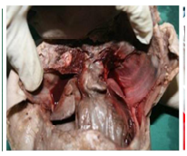 The thoracic cage was opened following the procedure described in the literature (Figure 2).3 Middle mediastinal was exposed after removal of the lungs. The pericardium covering the heart was slit open from the diaphragm to the aorta and the heart was exposed after reflecting pericardium. By lifting the apex of the heart the pulmonary veins were excised at the place where they form the boundary for oblique pericardial sinus. Finally the serous pericardium was reflected to separate the heart from its position. Then a deep cut 2cm to the left of anterior interventricular groove parallel to the left of interventricular septum was made. After opening the left ventricle to the ascending aorta, the bicuspid valve was exposed.