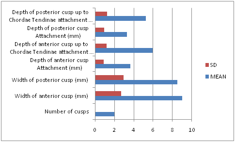 Table 2 shows mean, SD and P values of the depths of anterior and posterior cusps in both groups and sexes. This table reveals that depth of anterior cusp attachment, depth of anterior cusp up to Chordae tendinae attachment, posterior cusp attachment and posterior cusp up to Chordae tendinae attachment were significantly increased in male foetuses and this increase was statistically significant. But it is not statistically significant in female fetuses.