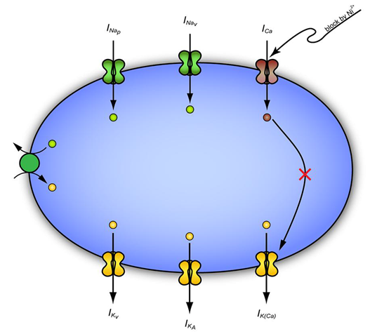 Figure 1 A hypothetical model showing the excitability of leech Retzius nerve cells that depends upon interplay of inward and outward current. Ni2+ blocks both Ca2+-channel and Ca2+-activated K+ channel and allowing Na+ to pass via Na+-channel leading to generation of PDS. The presence of Na+/K+ pump activity, outward K+ currents are supposed to reduce the excitability.