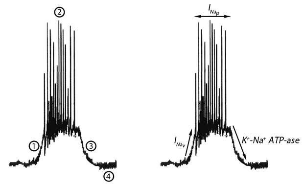 INaP represents a non-inactivating fraction of the cellular Na+ current which is tonically active within the voltage range of spike after depolarization.7 Persistent sodium channels which activates around ~-65mV also plays a crucial role in burst generation. Na+-dependent bursting can be checked with antagonist of persistent sodium channel blockers called riluzole in hippocampus.7 Interestingly, the effects of riluzole on the PDS per se in leech Retzius nerve cells, will be powerful drug to examine whether Na+-dependent bursting in the leech resembles with those of Na+-dependent bursting in the CA1 hippocampus. However,1‒3 studies exclusively use Ni2+ which is unlikely to mask the activity of persistent Na+-current. It is likely that INaP remained functional hitherto, even though Ca2+-activated K+ channel has been suppressed (Figure 1 & Figure 2). On the other hand, manipulations that increase the magnitude of INaP, in presence of lowering extracellular Ca2+ ion, enhance bursting of hippocampal CA1 neuron by an INaP dependent mechanisms.7 Besides direct INaP dependent mechanisms, other interfering cellular machinery like Na+/K+ pump may further pinpoint toward the termination of seizure as they have been implicated in Retzius nerve cells (Figure 2).